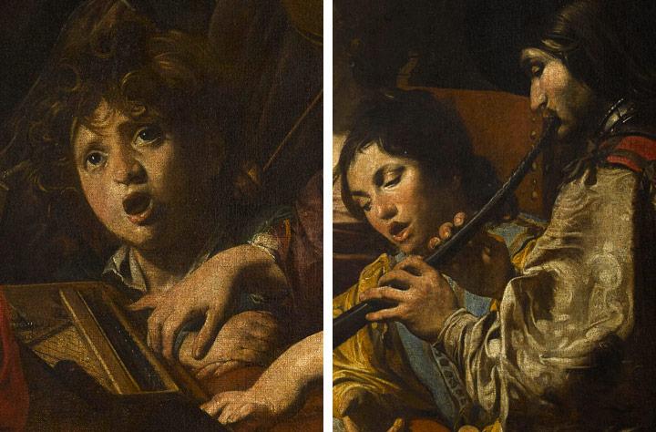 On the left, a child totally committed to singing while a woman accompanies him on a spinet. How about his delicately folded hands? On the right, Valentin, the master of gesture, catches two musicians who seem unaware of the "snapshot" being captured. Valentin de Boulogne (French, 1591–1632). A Concert (two detail views), ca. 1628. Oil on canvas; 69 x 85 1/8 in. Musée du Louvre, Paris (Inv. 8252)
