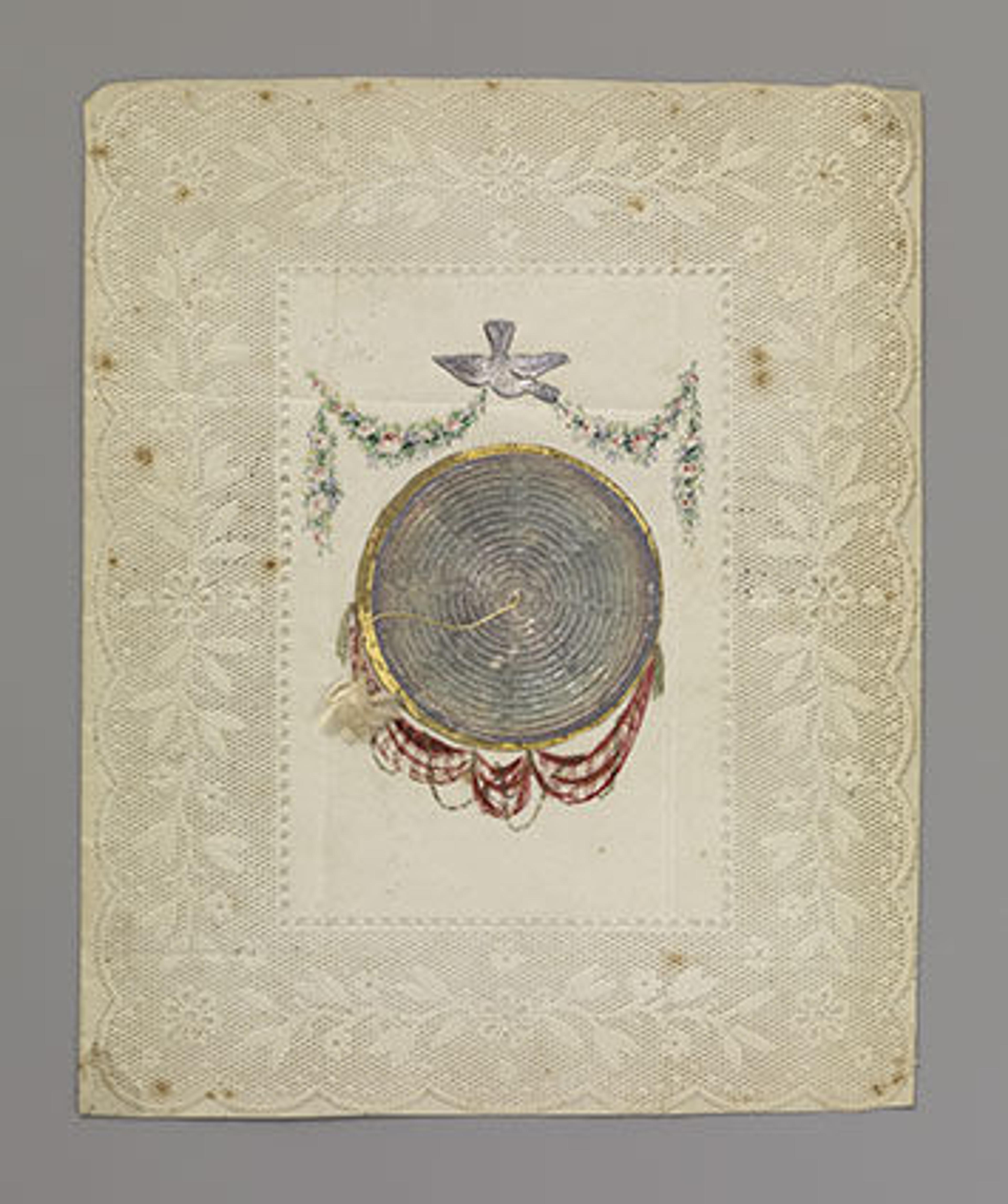 Anonymous (American or British, 19th century). Cobweb valentine, 1830–40. Watercolor, cut tissue on board, Diameter: 6 1/2 in. (16.5 cm). The Metropolitan Museum of Art, New York, Gift of Mrs. Richard Riddell, 1981 (1981.1136.510)