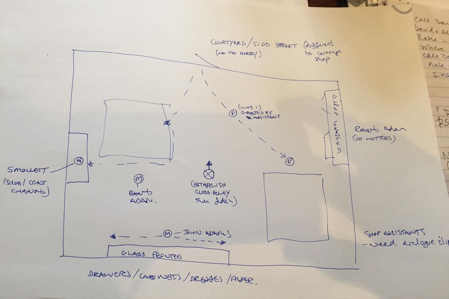 In sketches like this one for "Getting Dressed for Court," Chris Timpson and I mapped out how actors would need to move around the binaural recording head to take advantage of its dimensional capabilities. Photo by Nina Diamond