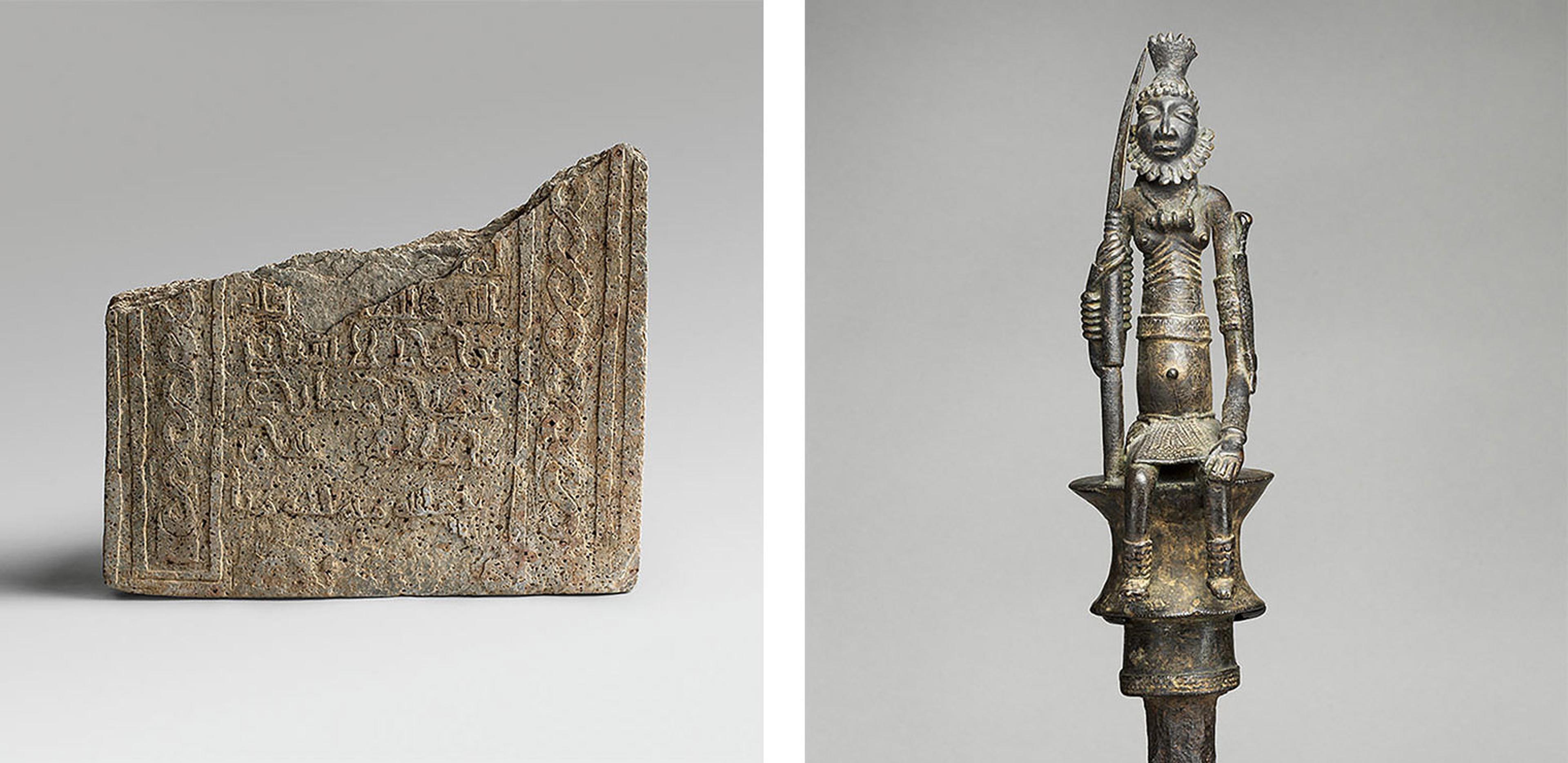 Left: Commemorative Stela for Queen M.s.r (or M.s.n) Inscribed in Ornamental Kufic, 1119. Mali, Gao or Saney. Schist, 36 1/4 x 17 in. (92.1 x 43.2 cm). Institut Fondamental d’Afrique Noire Cheikh Anta Diop, Dakar, Senegal (IFAN) (SO-50-45). Right: Staff: Seated Male Figure, 16th–17th century. Mali, Dogon or Bozo peoples. Copper alloy, iron, 30 1/2 x W. 4 1/4 x D. 4 in. (77.5 x 10.8 x 10.2 cm). The Metropolitan Museum of Art, New York, Purchase, Edith Perry Chapman Fund, 1975 (1975.306)