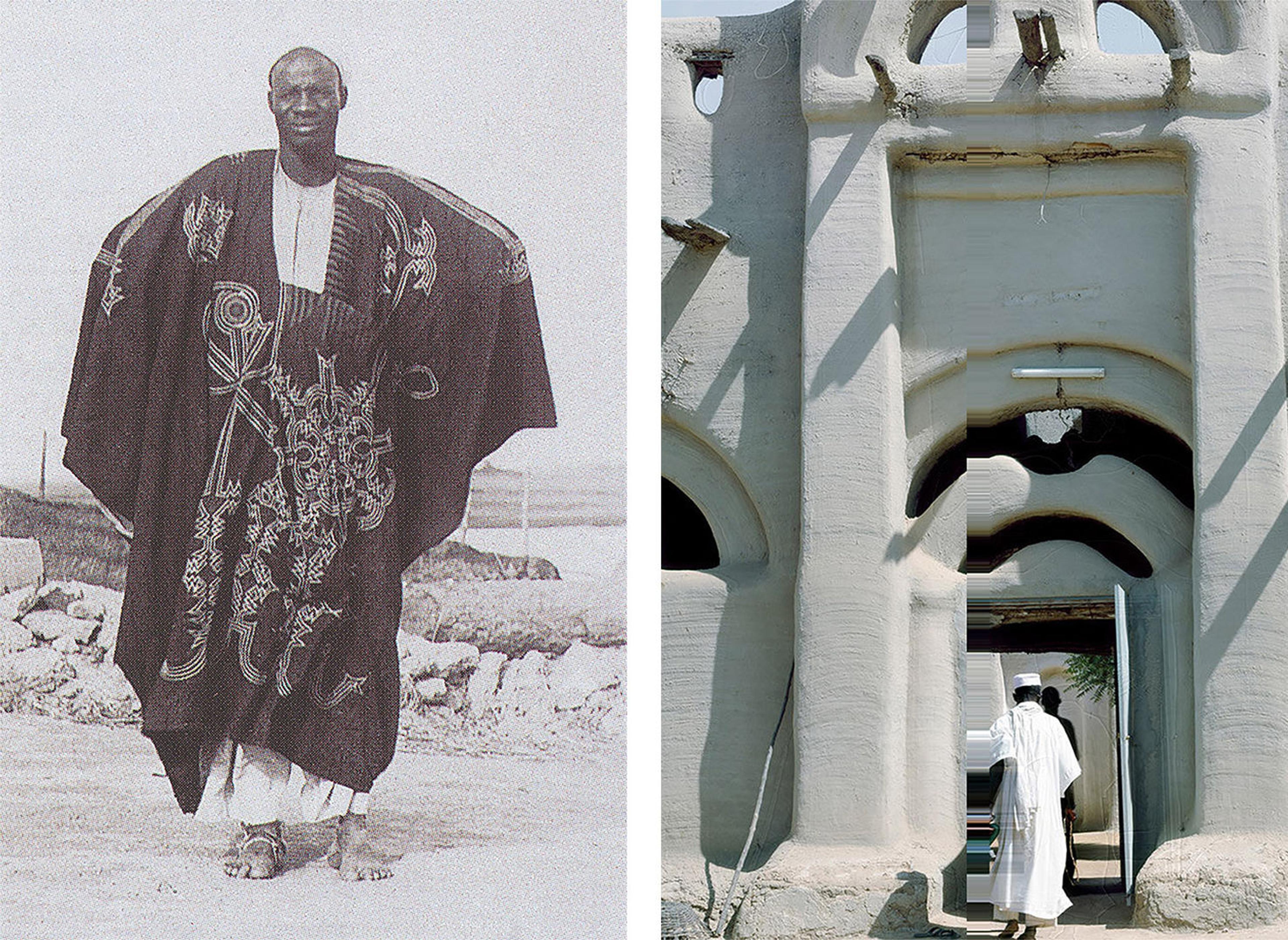 Left: Earliest photographic record of a lomasa worn by an unidentified man in Jenne, Mali, 1893–94. Photograph by Albert Rousseau. Published in Bernhard Gardi, Le boubou—c'est chic: Les boubous du Mali et d’autres pays de l'Afrique de l'Ouest (Basel, 2002). Right: Jenne, Mali, 1999–2000. Photograph by James Morris