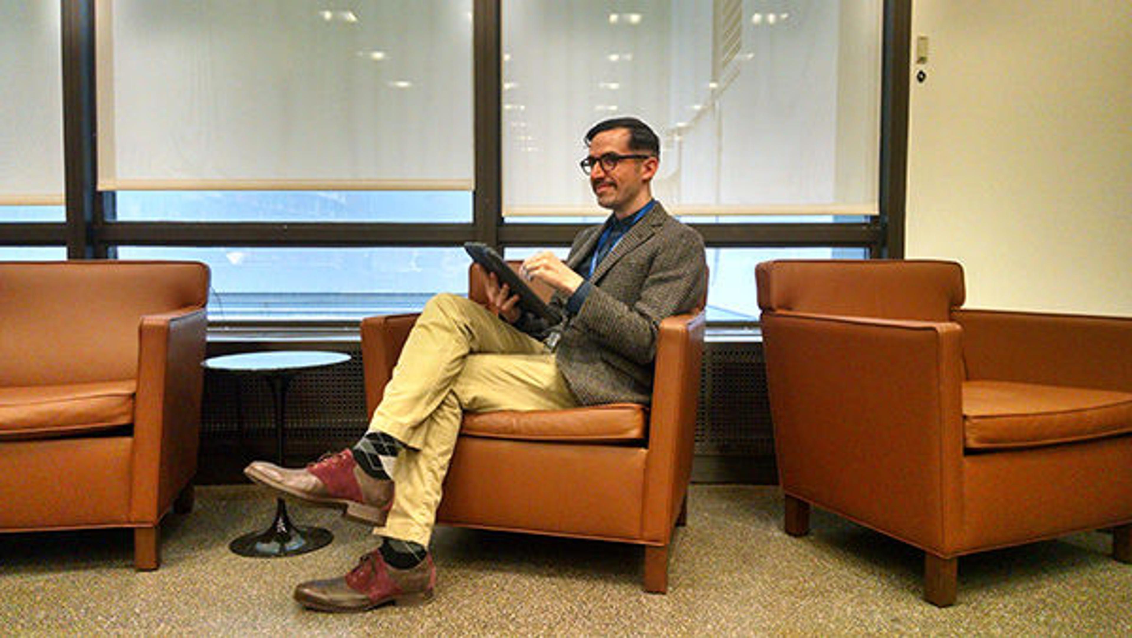 Watson Library Graduate Assistant Walter Schlect uses a library iPad while enjoying Watson's soft seating.