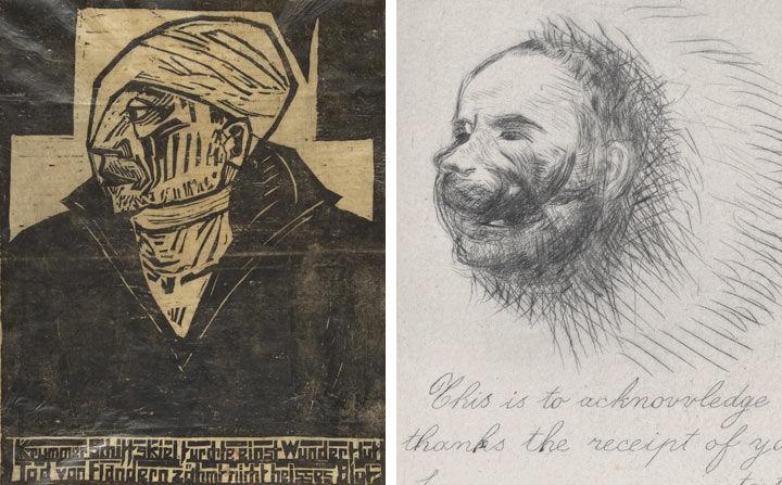 Left: Erich Heckel (German, 1883–1970). Wounded Sailor (Verwundeter Matrose), 1915. Woodcut printed on parchment, sheet: 16 1/16 x 13 5/16 in. (40.9 x 33.9 cm). The Metropolitan Museum of Art, New York, Gift of Dietrich von Bothmer, 2002 (2002.234.3). © 2017 Artists Rights Society (ARS), New York. Right: Auguste Rodin (French, 1840–1917). Contribution receipt of the Special American Hospital in Paris for Wounds of the Face and Jaw (detail), 1916. Drypoint, first state of two, plate: 6 3/4 x 4 3/16 in. (17.2 x 10.7 cm). The Metropolitan Museum of Art, New York, Purchase, The Elisa Whittelsey Collection, The Elisha Whittelsey Fund, 1959 (59.599.48[1])