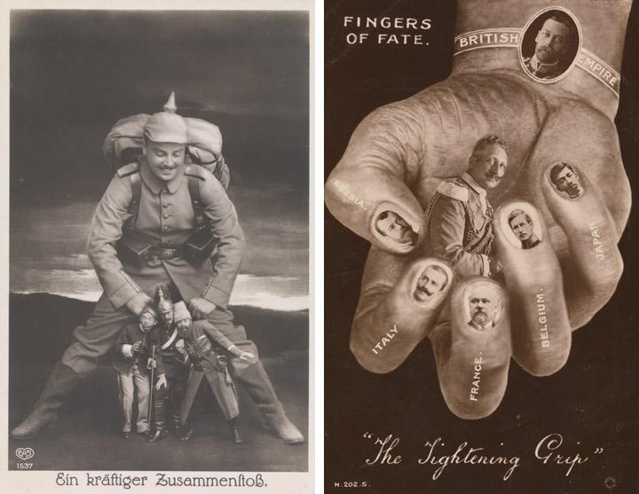 They could be imbued with humor, as in A Powerful Collision, which shows the German soldier knocking together the heads of doll-like figures representing France, Britain, and Russia. You don't get a sense of death or destruction; it's more like a cat's game of playing with toy mice without real consequences or death. The same is true for Fingers of Fate—The Tightening Grip; there's no real threat of physical violence. It's a sanitized version of what the war was, but these images, along with other postcards showing zeppelins flying above cultural icons and monuments, were designed to inspire the members of the country that issued the card, as well as to instill fear in the country depicted. There's something about these postcards that could maintain an enthusiasm because they were so affordable, easy to mass-produce, and they could be carried to war, collected, and exchanged.