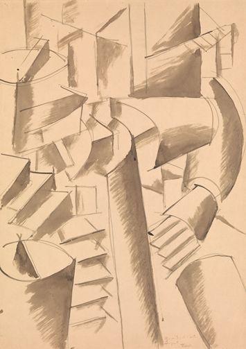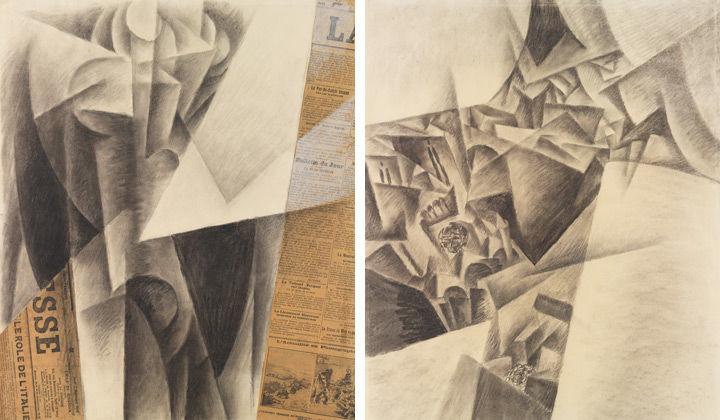 Left: Gino Severini (Italian, 1883–1966). Still Life: Bottle + Vase + Journal + Table, ca. 1914–15. Charcoal, gouache, and cut and pasted newspaper on paper, 22 1/8 x 18 3/4 in. (56.2 x 47.6 cm). The Metropolitan Museum of Art, New York, Alfred Stieglitz Collection, 1949 (49.70.20). © 2017 Artists Rights Society (ARS), New York. Right: Gino Severini (Italian, 1883–1966). Flying over Rheims, 1915. Charcoal on paper, 22 3/8 x 18 5/8 in. (56.8 x 47.3 cm). The Metropolitan Museum of Art, New York, Alfred Stieglitz Collection, 1949 (49.70.22). © 2017 Artists Rights Society (ARS), New York