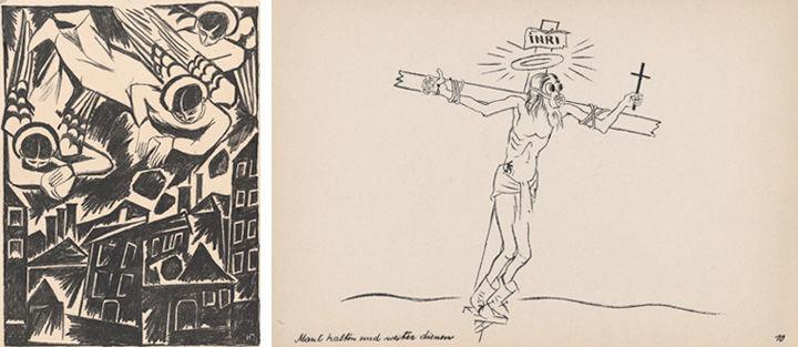 Left: Natalia Goncharova (French [born Russia], 1881–1962). Doomed City from Mystical Images of War, 1914. Lithograph, sheet: 12 1/2 x 9 in. (31.8 x 22.9 cm). The Metropolitan Museum of Art, New York, Bequest of William S. Lieberman, 2005 (2007.49.581). © 2017 Artists Rights Society (ARS), New York. Right: George Grosz (American [born Germany], 1893–1959). Shut Up and Do Your Duty (Maul halten und weiter dienen) from Hintergrund, 1927 (published 1928). Photolithograph, sheet: 6 5/8 x 10 7/8 in. (16.8 x 27.6 cm). The Metropolitan Museum of Art, New York, Purchase, Janice Carlson Oresman Gift, 2017 (2017.53.10). Art © Estate of George Grosz/Licensed by VAGA, New York, NY