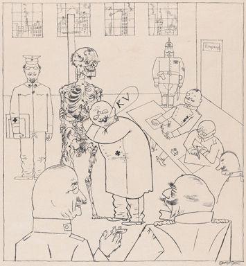 You have this with Grosz—who was opposed to the war and nationalistic politics even before the fighting began—who nonetheless was conscripted and had a breakdown before seeing the front lines. He was hospitalized and would be brought before the medical review board every so often, beaten up by other soldiers, and threatened with having to serve. German Doctors Fighting the Blockade is likely a self-portrait—you can see this in the glasses that resemble Grosz's worn by the skeleton—and the doctor is pronouncing "K.V.," which meant that the skeleton was fit to serve. It's definitely a reference to Grosz's own experience. You see this with the Heckel with the bandages on the head and the scars of the face, it conflates the external and internal damage, and then the inclusion of the cross behind him makes reference to martyrdom.