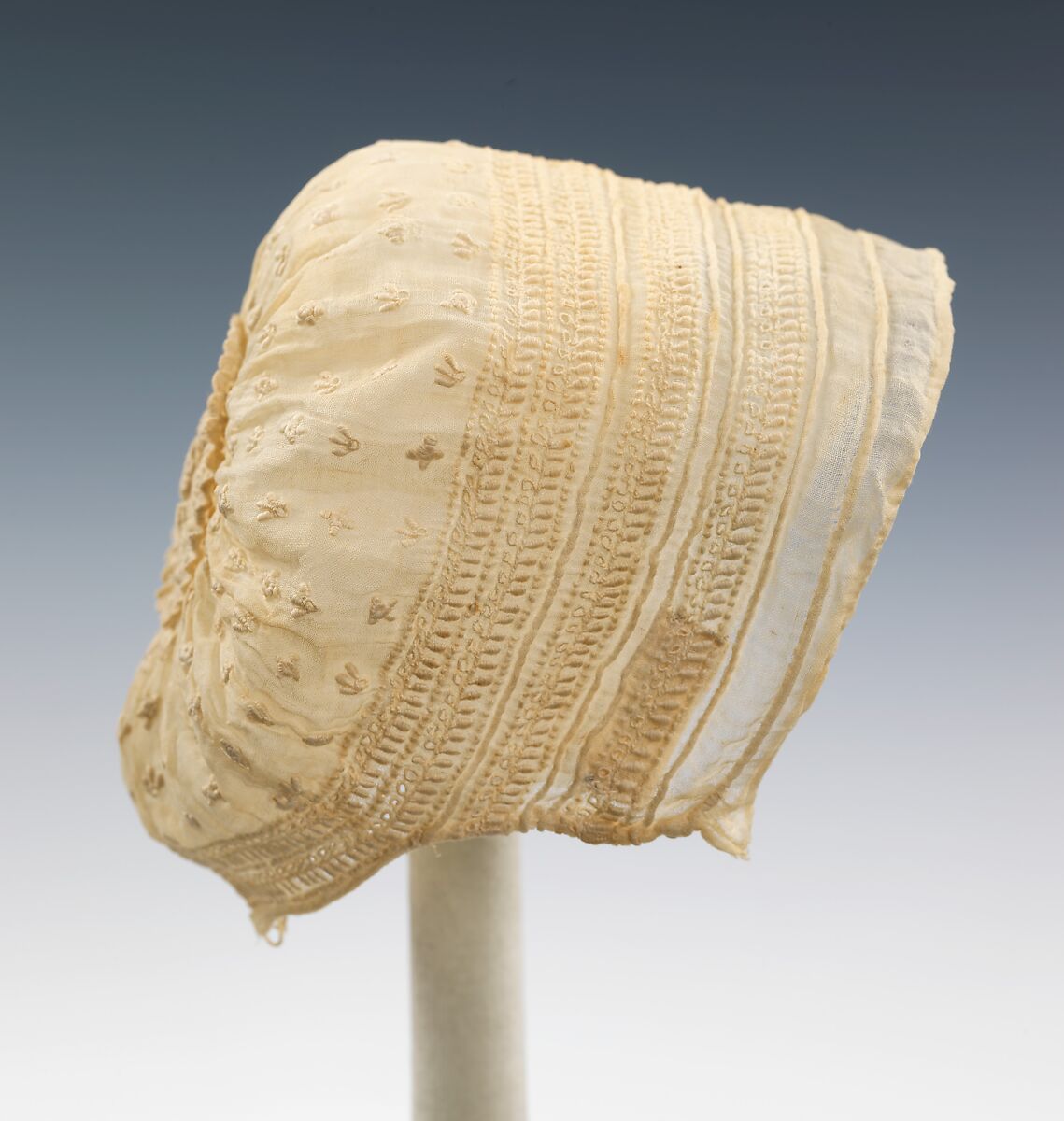 As was the case for centuries, children's clothing in the early 19th century continued to be modeled after adult clothing. This kind of cap, often made of linen and trimmed with embroidery or lace, was worn mainly at home by women and children throughout the eighteenth and nineteenth centuries. The cap also served as protection from the cold and from drafts, which were thought to cause illnesses such as colds and sore throats.