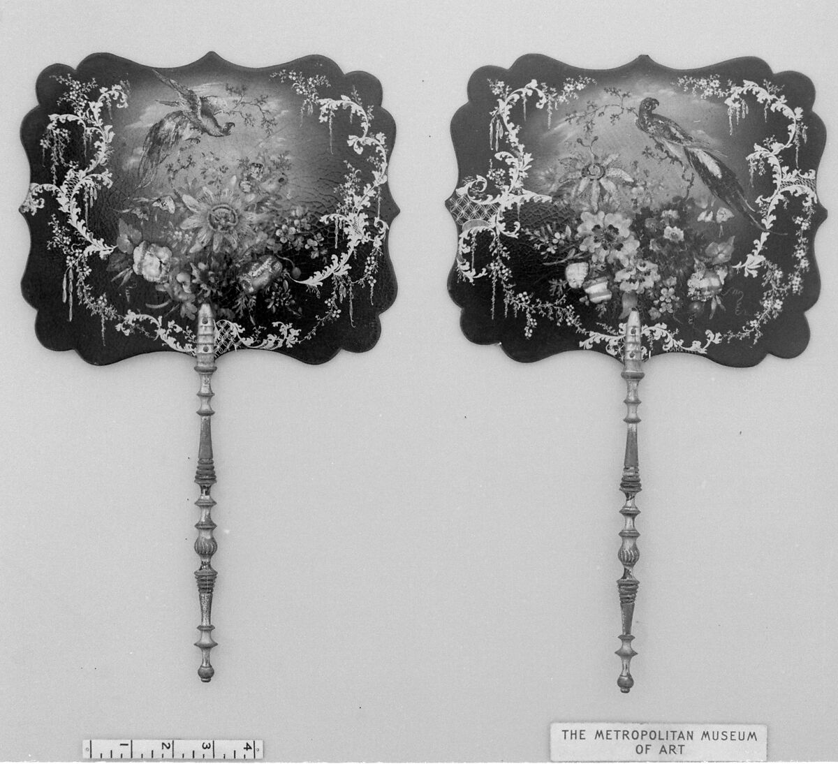 - Medium: Papier-mâché, black painted and gilded, inlaid with mother-of-pearl, gilt wooden handle