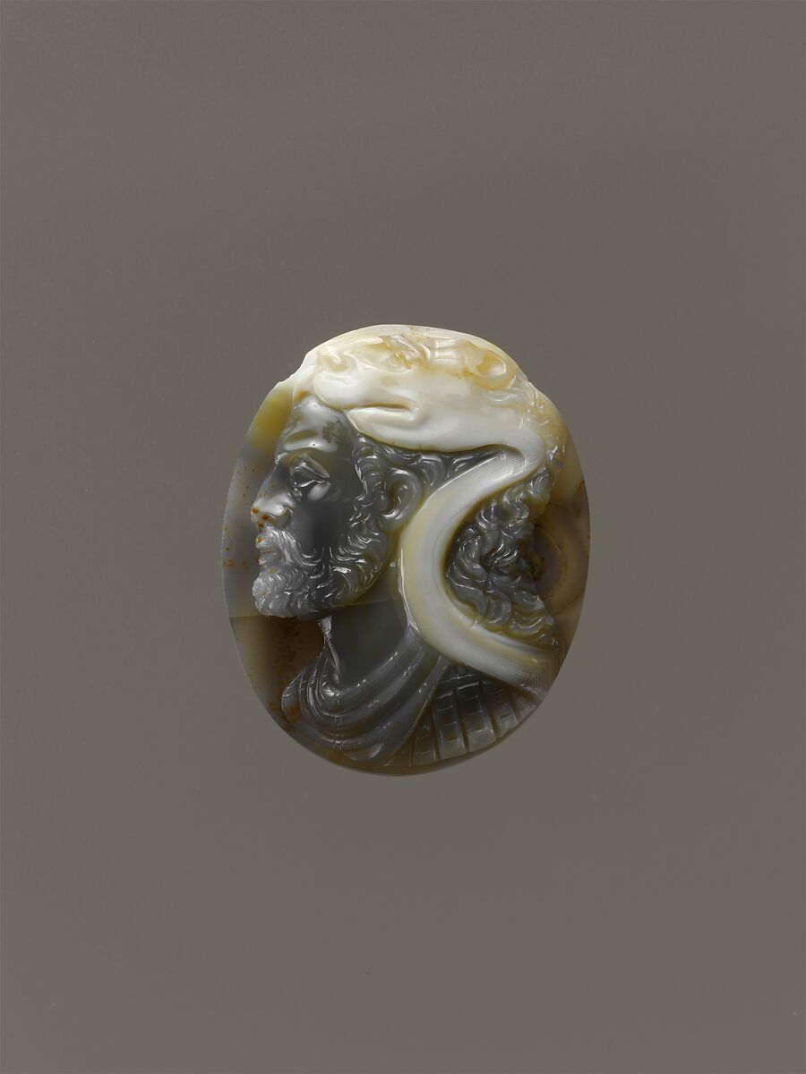 Gems carved on the back as well as the front became a specialty of sixteenth-century masters. Omphale, legendary queen of Lydia, was a mistress of Hercules. The zigzag of white that emerged in both sides of the grayish brown morsel of agate forcefully highlights both his lion skin and her veil.