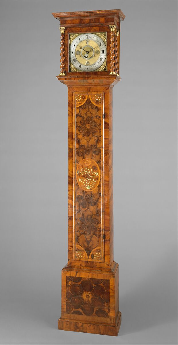 Case: oak veneered with walnut, panels of oystershell-cut olive wood; marquetry panels of green-stained bone, ivory, various woods; mounts: gilded brass; dial: gilded and silvered brass; movement: brass, steel