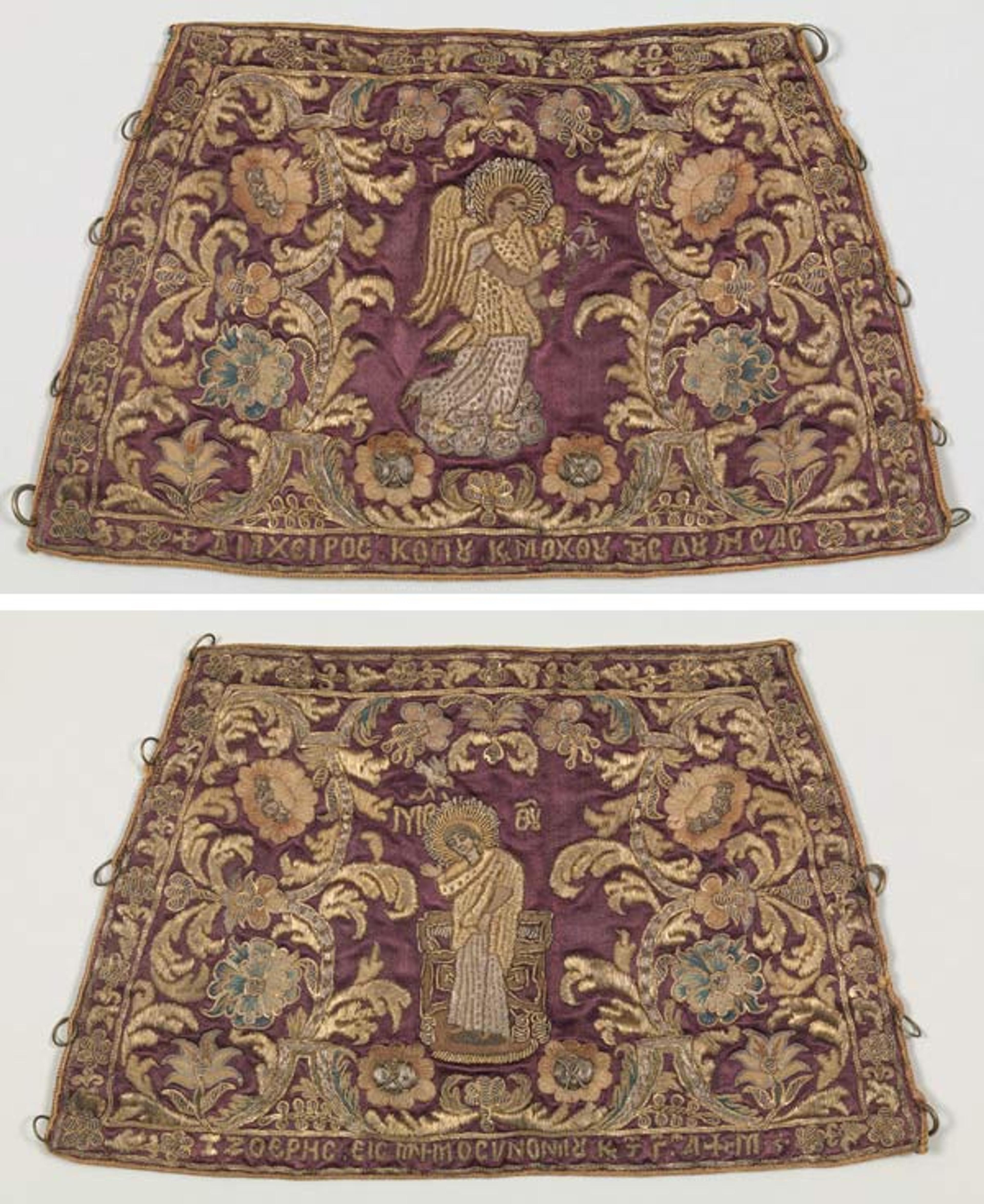 This veil formed a boxlike cover for the chalice during portions of the liturgy. Its central image shows the young Christ blessing from within a chalice, flanked by Arabic script labeling him Jesus, the Messiah. The Greek inscription surrounding the medallion speaks of Christ’s sacrifice, while the Georgian inscriptions at the ends of the cross-arms plead for the donor, the nobleman Solomon Shavrashidze.