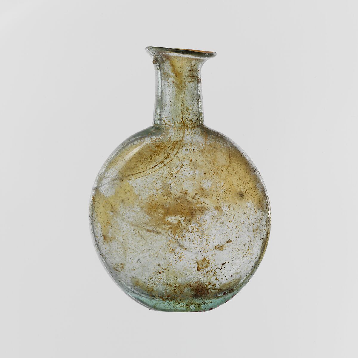 Uneven, rounded rim; small, flaring mouth; cylindrical neck, tooled in around base; globular, flattened body; small, flattened pad with pontil marks on bottom.