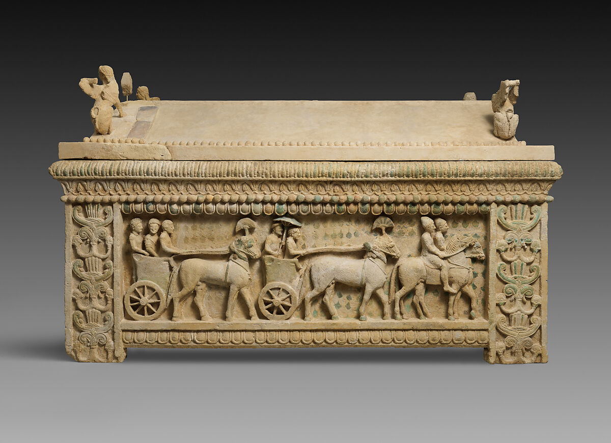 Este sarcófago, que, sem dúvida, pertenceu a um rei de Amatus, é talvez a peça mais importante da rica coleção de arte cipriota do Museu. É notável pela cor preservada em sua superfície. As imagens expressam o poder do rei e sua devoção aos deuses cipriotas durante o século V a.C., caracterizado por sua diversidade cultural. Nos dois lados compridos, uma procissão de carruagens é escoltada por cavalheiros, seguidos por soldados de infantaria. A figura sob o guarda-sol é sem dúvida o personagem principal. Nos dois lados estreitos aparecem as figuras de Astarté, deusa do Oriente Próximo e uma fileira com figuras do deus egípcio Bes. Ambas as divindades estão associadas com a fertilidade.