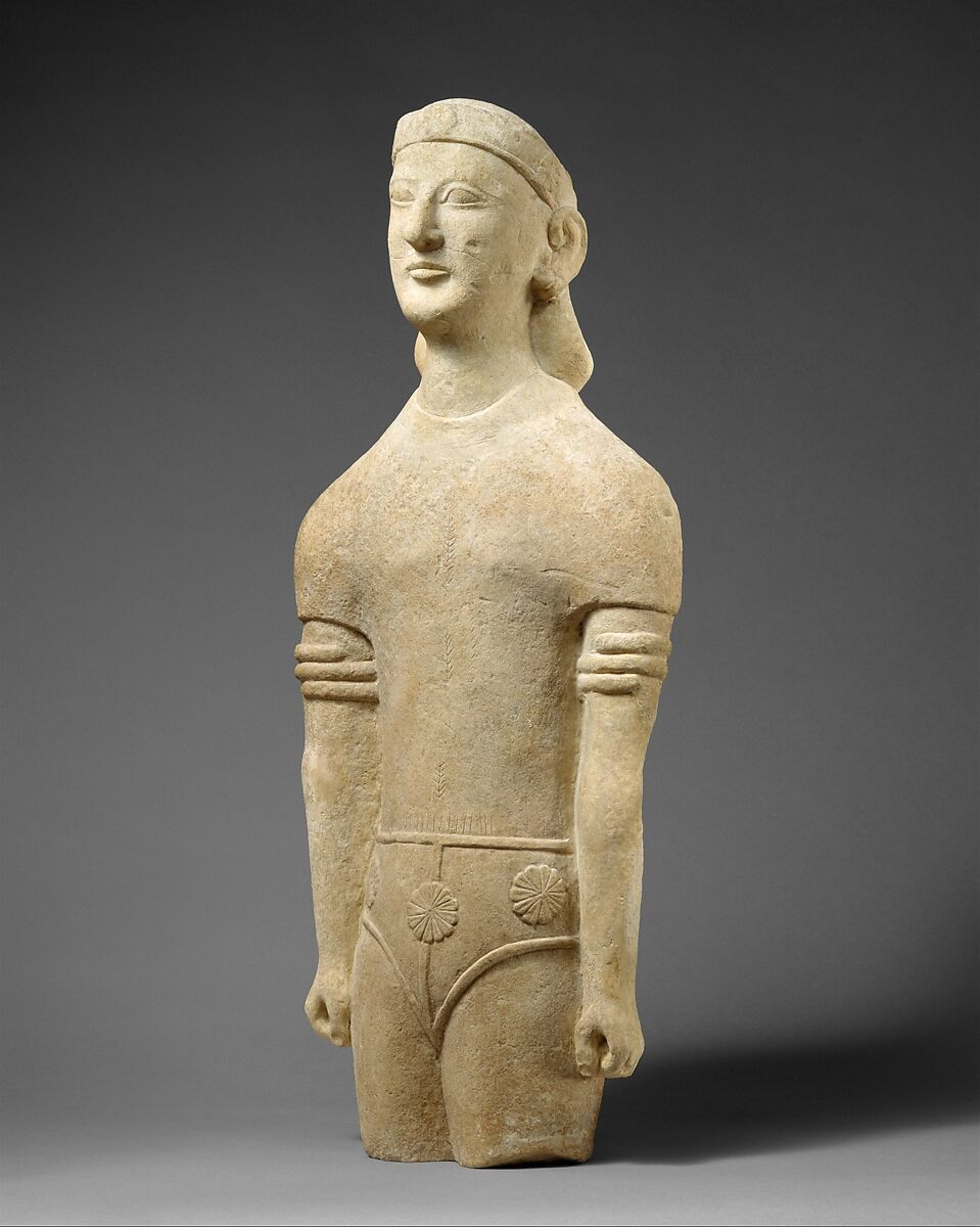 This figure exemplifies a well-established type that appears in Cypriot sculpture at the end of the seventh century B.C. The men are always under lifesize, beardless, and dressed in a close-fitting tunic, brief loincloth often decorated with rosettes, and headband with rosettes. The example here also wears earrings and bracelets. The identity of these figures is difficult to define precisely, but they are probably young men of high rank in some form of service to a deity. In this piece, the head may not belong to the body, but it is typologically accurate.