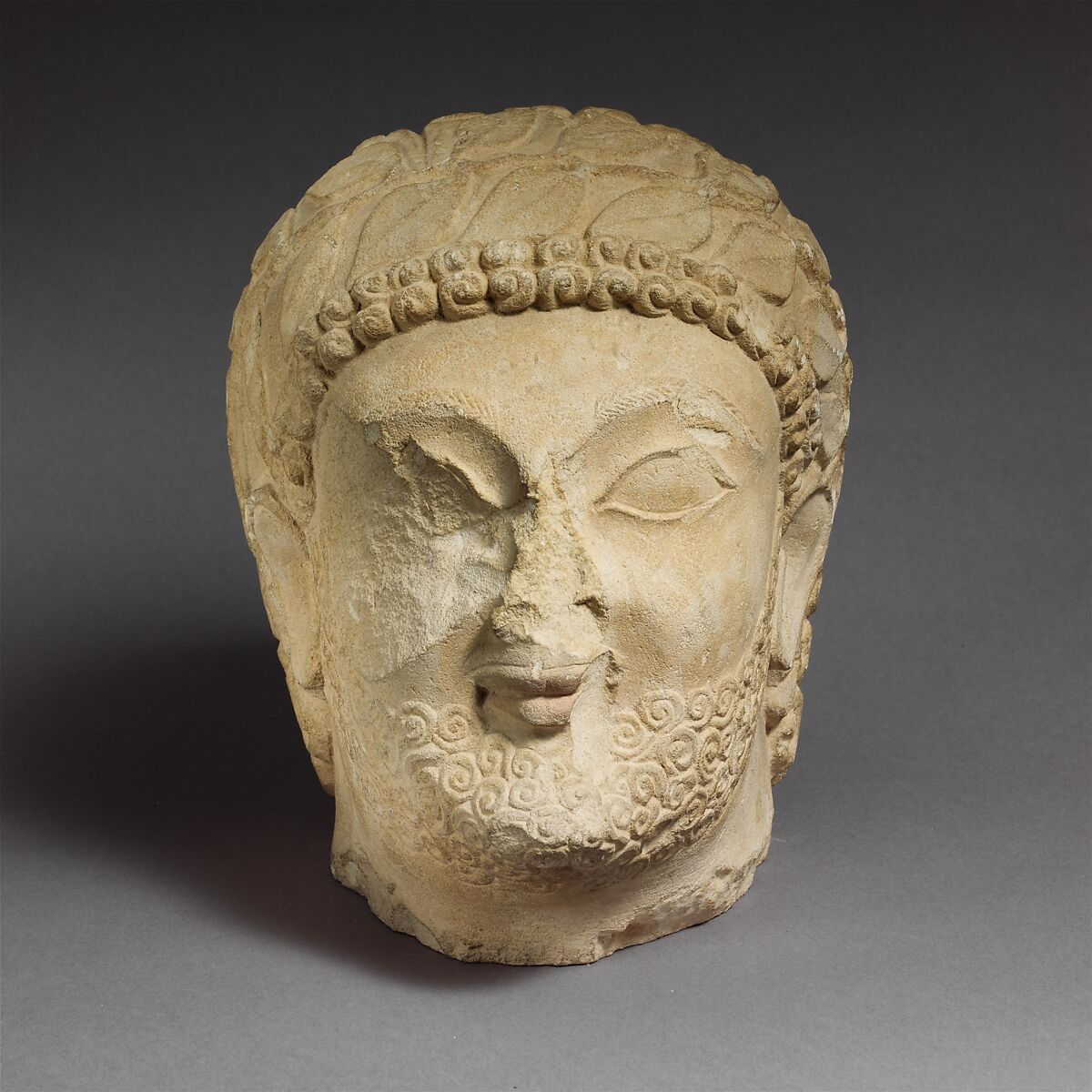 - Title: Limestone head of a bearded male with a wreath of leaves