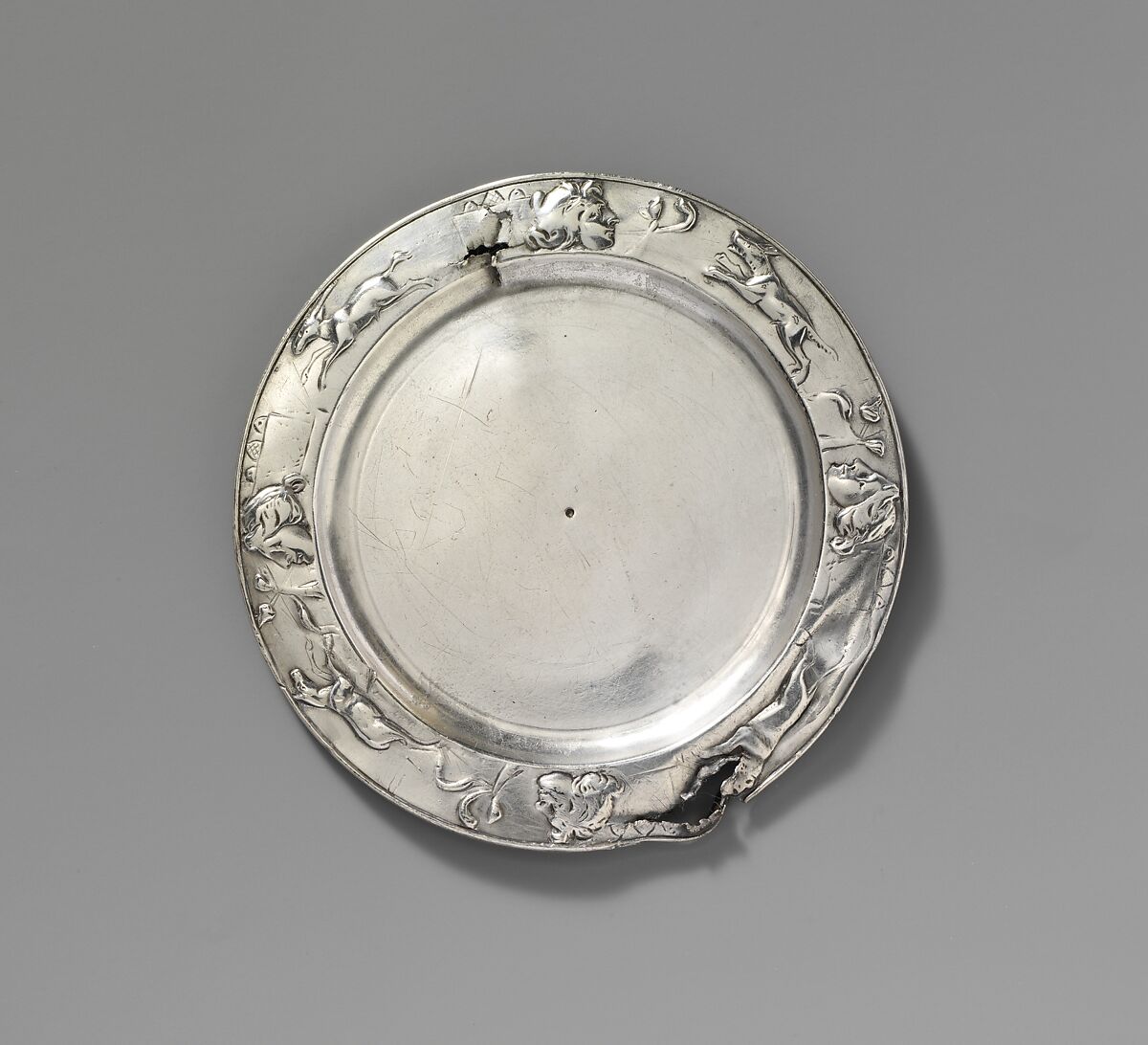 The plate, originally part of a larger set of silver tableware, was clearly used over a prolonged period, since repeated polishing in antiquity has worn away the details of the rim decoration. On the underside are Latin inscriptions giving the names of two different owners. It was common for Romans to mark their valuable possessions in this way as a precaution against theft. The use of masks, symbols, and animals as decoration seen here was popular throughout the Imperial period.