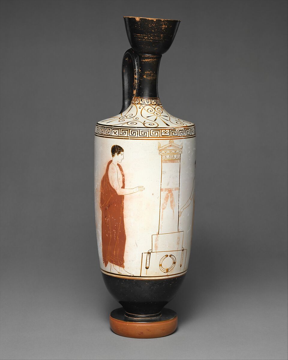 This vase exemplifies Attic white-ground funerary lekythoi at their finest. Funerary representations of the sixth century B.C. depicted the deceased surrounded by mourners. By the middle of the fifth century, the deceased was shown either as living or not at all. The figure at the left is a mourner; the deceased is identifiable by the diminutive soul fluttering above his head.