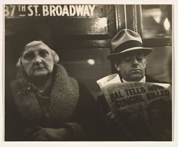 During the winter months between 1938 and 1941, Evans strapped a camera to his midsection, cloaked it with his overcoat, and snaked a cable release down his suit sleeve to photograph New York City subway passengers unawares. In his book of these unposed portraits, Many Are Called (1966), the artist referred to his quarry as "the ladies and gentlemen of the jury." What he was after stylistically, though, was more in keeping with the criminal mug shot: frontal and without emotional inflection. In this photograph, the tabloid headline "PAL TELLS HOW GUNGIRL KILLED" across the newspaper nods to Evans’s interest in vernacular source material.