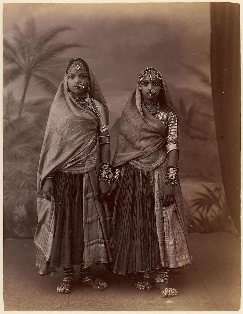 - Title: [Two Hindu Women in Elaborate Jewelry, Before Studio Backdrop with Palm Trees]