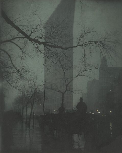 Embora a paleta de Steichen evoque as pinturas noturnas de Whistler e o ramo de árvore no primeiro plano seja um elemento utilizado com frequência nas gravuras japonesas tão populares na Paris do século XIX, o tema é claramente moderno e americano. O recém terminado arranha-céu com vinte e dois andares localizado em Madison Square, Nova Iorque, é tão alto que não cabe na composição. Steichen fez três impressões do Edifício Flatiron, cada uma com uma tonalidade diferente, evocando momentos sucessivos do entardecer. Essas imagens, que estão entre os tesouros mais valiosos da coleção de fotografia do Museu, são a prova de que a fotografia pode rivalizar com a pintura por sua escala e cor, bem como por sua individualidade e expressividade.
