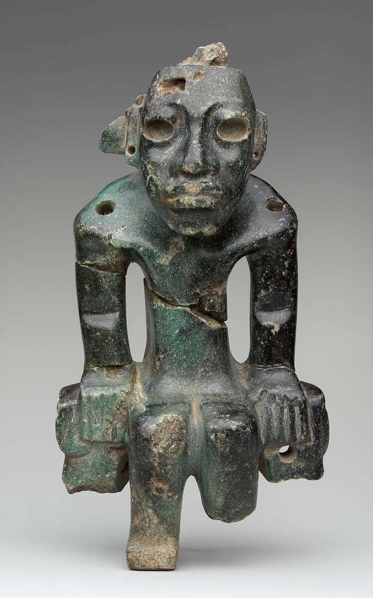 A stylized figure sits on a bench gazing forward in this small-scale greenstone sculpture. The individual depicted has stylized proportions and elongated features, though largely displaying human attributes. The sculptor carefully contoured the face of the individual with a stolid expression, deeply drilling the eyes for the addition of probable inlays of other precious material like shell or obsidian. The squared ears also contain small drill holes for the addition of beads or other adornments. The arms, separated from the body by linear drill holes, display subtle musculature and terminate in blocky hands that rest on the bench to the side of either leg. Drilled holes through each shoulder may have once served to attach other perishable elements such as a cloak or other garment, and other holes in the throne might have served the same function.