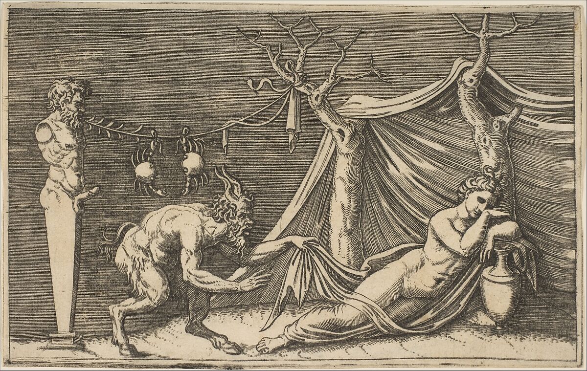 - Title: A satyr discovering a sleeping woman; two crabs hanging from a rope which is strung between a term and a tree