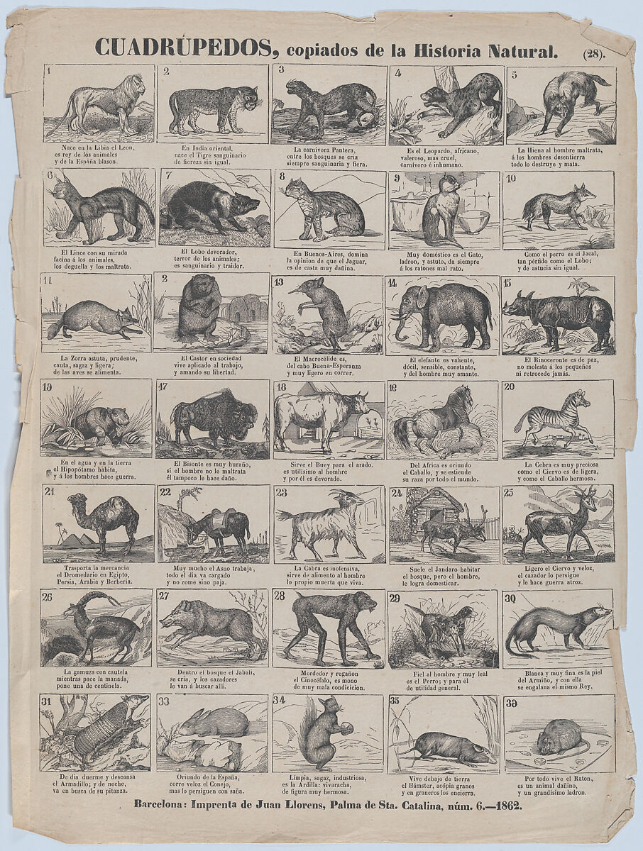 - Title: Broadside with 36 images of quadrupeds (animals)