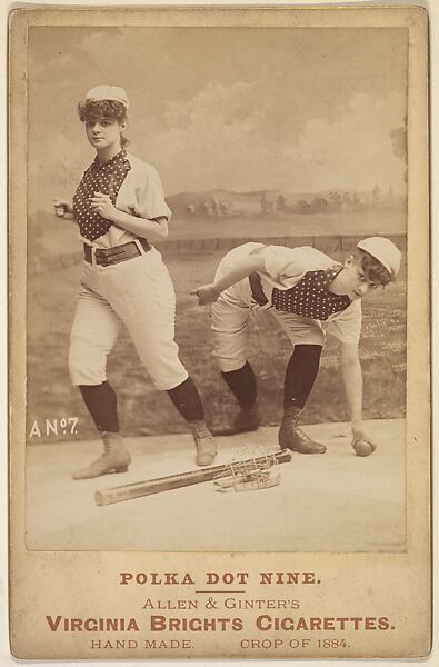 Cabinet card photographs issued as advertising cards for the series "Cabinet Photos, Allen & Ginter" (H807), issued in the mid-1880s to promote Allen & Ginter cigarette brands. There are four types of cards in the series: Type 1 cards are labeled "Black Stocking Nine"; Type 2 cards depict the "Polka Dot Nine"; Type 3 cards are titled "Girl Cyclists"; and Type 4 cards represent "Yacht Club Contestants".