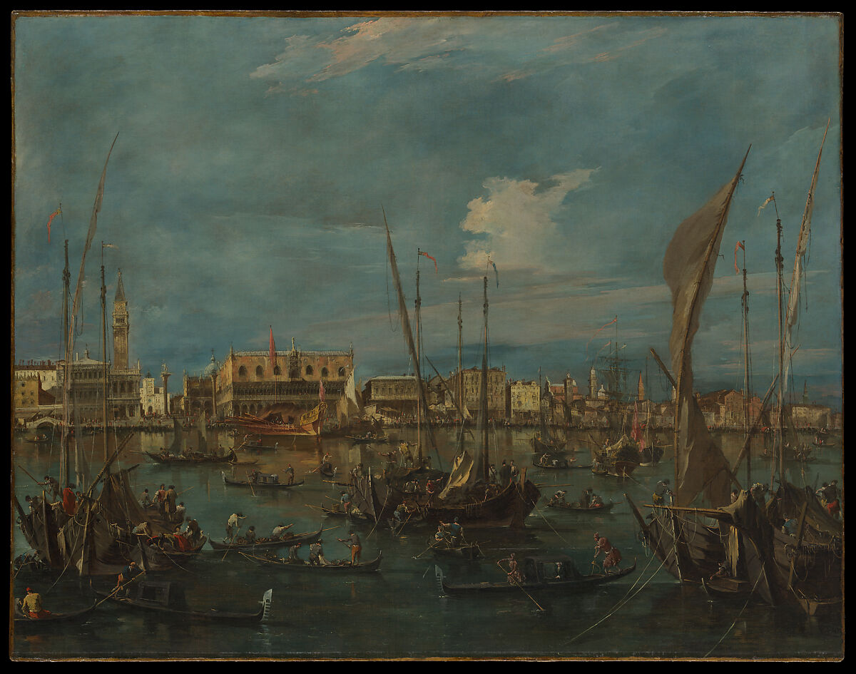 This is an early, important example of a view painting by Guardi, an artist one generation younger than Canaletto, whose work is nearby. It juxtaposes a relatively frontal lineup of buildings along Venice’s emblematic Piazza di San Marco, including the ducal palace and bell tower, with the flurry of activity on the water, enlivened by the intersection of masts, rigging, oars, and countless figures at work. In contrast to Canaletto’s clarity of light and solidity of form, Guardi’s looser paint handling encourages the imagination to fill in the gaps, resulting in a greater sense of animation.