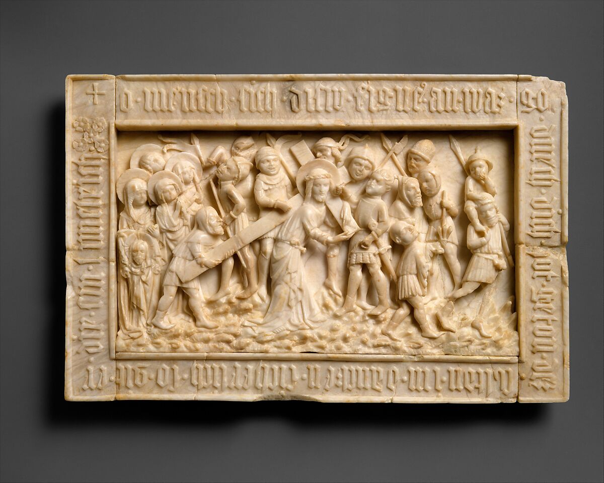 The power of this devotional image of Jesus bearing the Cross and suffering the torments of his persecutors is deepened by the German inscription, which addresses literate viewers directly: "O mankind, behold this figure; what God has done for you should be kept in your thoughts, for thus he gives you his heavenly kingdom."