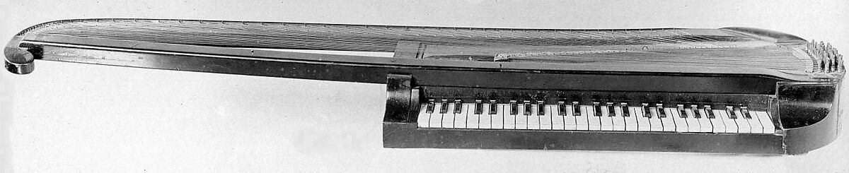 This portable piano was invented by Carl Leopold Röllig of Vienna around 1795. It is named after Orpheus, the mythical musician who charmed the gods with his lyre. The orphica can be held across the lap or suspended from the neck like a guitar. A neo-classical concept intended to appeal to female amateurs who would appreciate its grace, popular repertoire, and usefulness outdoors, the orphica enjoyed a local vogue that lasted briefly into the 19th century. This example's 4-octave range necessitates diminutive keys. The standard Viennese-type action strikes a single undamped string per note.