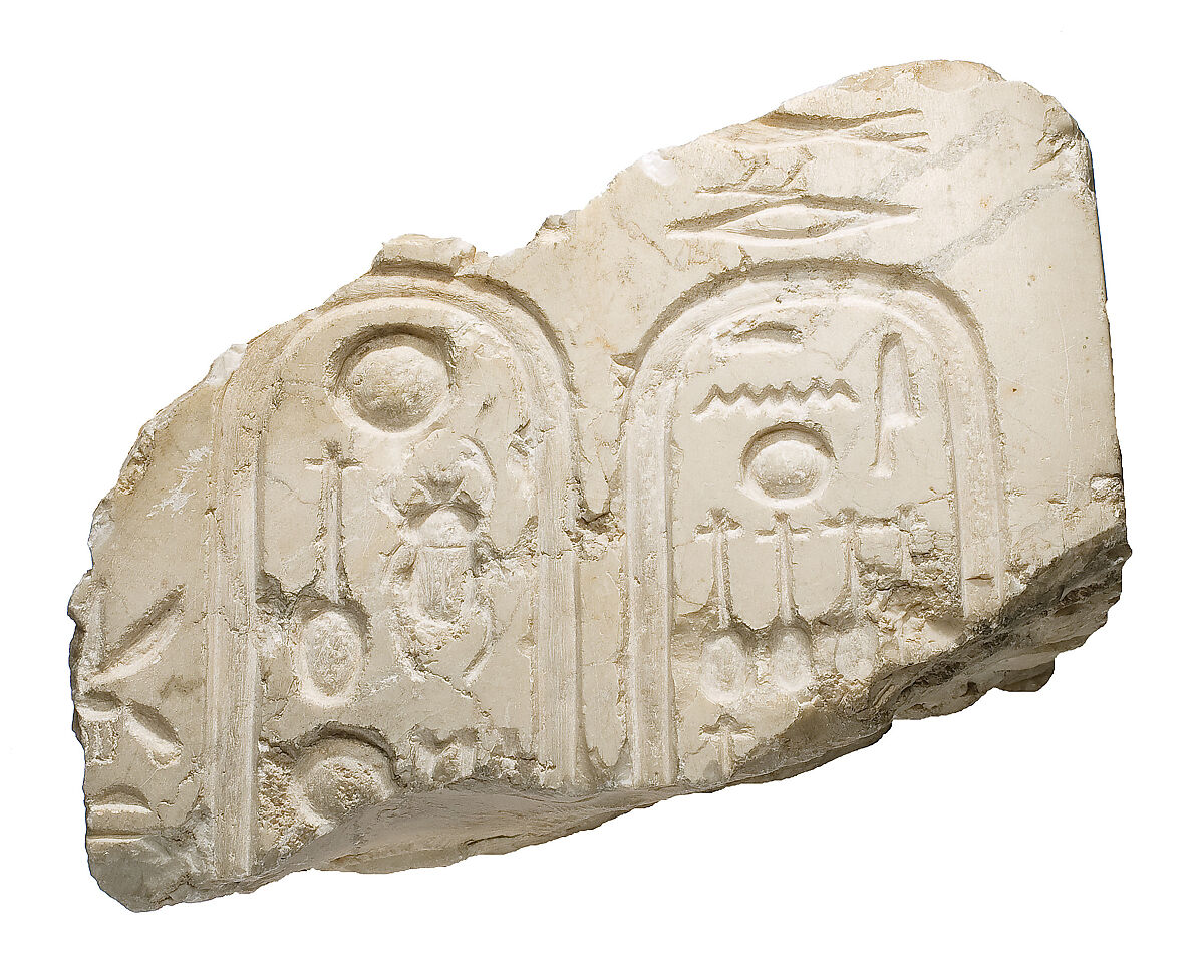 - Title: Inscribed fragment of a support pillar, Akhenaten, Nefetiti, Aten cartouches