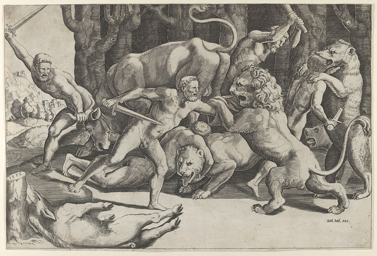 - Title: Five men fighting beasts, at lower left is a fallen boar