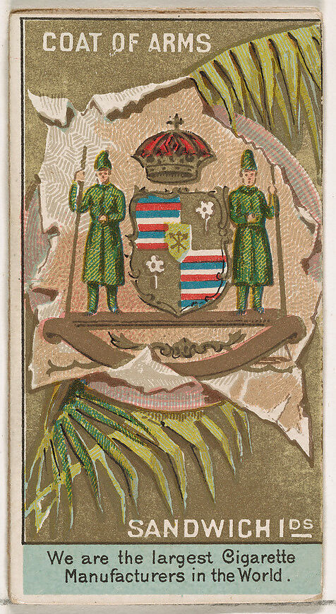 Trade cards from the "Rulers, Flags, and Coats of Arms" series (N126-2), issued in 1888 by W. Duke, Sons & Co. There are two types of cards from the series. The first type is made of thick stock and does not fold. This variation promotes Honest Long Cut tobacco. The second type, pictured here, is printed on thinner stock and is meant to be folded in three parts. This variation promotes Duke's Cigarettes, Cameo, and Turkish Cross-Cut brands.