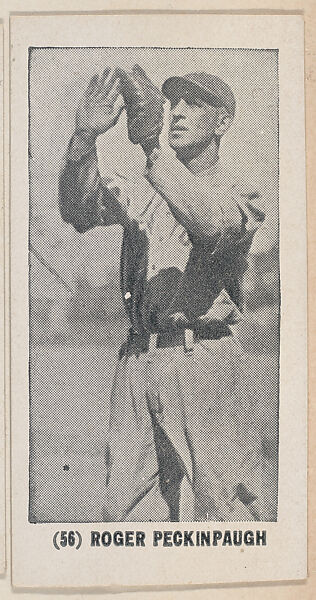 Roger Peckinpaugh trade card, from the Baseball Players photo series (W502), issued in 1928 and 1931. Front: black and white action-posed photo of player with white border. Back printed with "ONE BAGGER", "ONE BAGGER - Hold What You Got", "THREE BAGGER" or "HOME RUN" (with or without prize redemption) as well as blank backs. Believed to be collected as part of a baseball-related game. Possibly candy or ice cream issues. Set of 60 or 62.