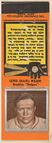 - Title: Lewis (Hack) Wilson, Brooklyn Dodgers, from the Baseball Players Match Cover design series (U1) issued by Diamond Match Company