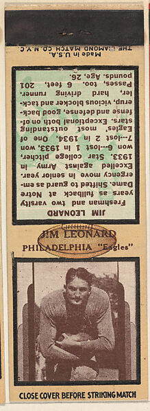 - Title: Jim Leonard, Philadelphia Eagles, from the Football Players Match Cover design series (U7) issued by Diamond Match Company