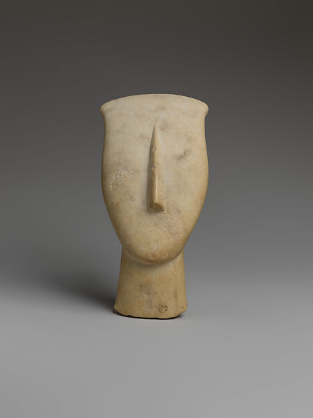 This fine-grained white marble head and most of the neck are all that survive from a figure that would have measured approximately 80.0 cm. The proper right upper corner and tip of the nose are restored. The backward tilted lyre-shaped head features a long wedge-shaped nose at the center. In the area of the right eye are traces of impacts made with a rectangular point approximately 4mm wide. The left ghost eye is caused by a faint, thin calcareous accretion rather than differential weathering of the calcite crystals. A very faint differential weathering is enhancing the presence of the pupil on the same left eye. Fine particles of goethite, hematite and black char are scattered on the surface and deposited in the recesses in the area of the ghost features, enhancing them. Few particles of cinnabar have been identified on the head’s forehead. There are fine linear tool marks at various locations on the surface.