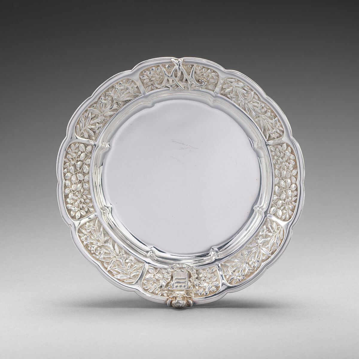 This silver ice cream dish and accompanying plates are part of one of the most renowned and lavish dinner services ever created in America. Commissioned in 1877 by John W. (1831-1902) and Marie Louise Hungerford (1843-1928) Mackay, the dinner service for twenty-four consisted of over 1,250 pieces. A poor Irish immigrant with little education, John W. Mackay became one of the wealthiest men in America when he and three partners, James Fair, James Flood, and William O’Brien, struck a silver deposit known as "The Big Bonanza" at Nevada’s Comstock Lode in 1873. During a visit to the mine, Marie Louise asked her husband for a silver dinner service "made by the finest silversmith in the country." Her husband responded, "You shall have it. I like the notion of eating off silver brought straight from the Comstock." He proceeded to have a half ton of silver delivered from the mine to Tiffany & Co., where two hundred men worked for almost two years to complete the commission. In 1878 the service was sent to be featured in Tiffany’s award-winning display at the Paris Exposition Universelle before being delivered to the Mackay’s home at 9 Rue de Tilsitt near the Arc de Triomphe. In an era of extravagant social affairs, Mrs. Mackay’s dinners and balls were legendary. Identified in firm records as "Indian," "Persian," and "Sou Chow" in style, the Mackay service reflects the sophisticated and innovative design sensibilities of Edward C. Moore, the head of Tiffany’s silver division, and the team of designers, chasers, and craftsmen who conceived and realized this commission. The descriptor "Sou chow" was used at Tiffany for designs featuring elaborately chased decoration inspired by Chinese, Japanese and Indian sources, all of which were extensively represented in the vast collection of works of art Moore assembled to inspire and educate himself and his staff. The masterfully chased ornament featuring a dense composition of flowers flowing into sinuous elephant trunk feet embodies Gilded Age extravagance and would have offered a dazzling finale to a meal served on a sea of silver featuring an inventive combination of Asian, Near Eastern, and Indian artistic vocabularies and aesthetic sensibilities.