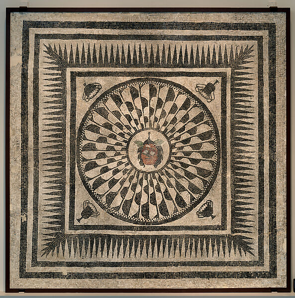 This work of art is currently on loan to the museum.The head of the Gorgon Medusa appears in the center of this mosaic floor panel, framed by a scale pattern of black-and-white bands with kantharoi or drinking cups in the corners. Feared for her ability to turn the living into stone, Medusa’s visage protected household members from harm, and is frequently found in Roman mosaics of this period. This example once adorned a small room in one of the most prominent residences in Pompeii, the House of the Citharist. It remained in place for more than a century even as the richly decorated house was renovated, expanded, and refurbished. The building was buried in the eruption of Mount Vesuvius in 79 CE.