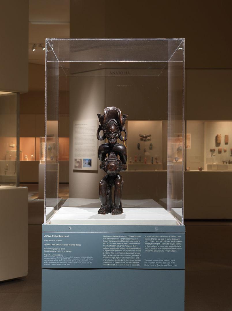 On Wednesday December 1st, 2021, a new guest was welcomed to the center of Gallery 403, on the second floor of the Museum in the galleries for Ancient Near Eastern Art. The nineteenth-century sculpture of a Chokwe chief, or Mwanangana, from Central Africa (1988.157) has been placed next to the ancient stone statue of Gudea (59.2), ruler of the city-state of Lagash in present-day southern Iraq. On an immediate level, the polished dark surfaces of the two sculptures serve to connect them, although the Chokwe sculpture is not of stone but of wood, a material that largely does not survive from ancient Iraq.