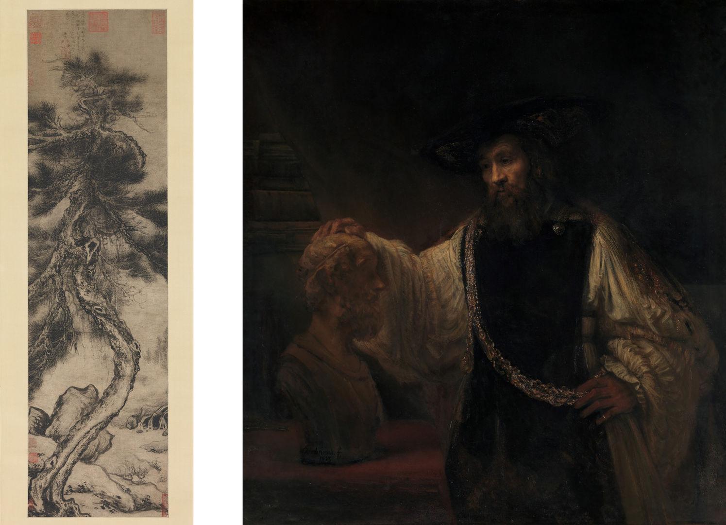 Left: Wu Boli (Chinese, active late 14th–early 15th century). Dragon Pine, late 14th–early 15th century. Hanging scroll; ink on paper, overall with knobs: 100 x 21 in. (254 x 53.3 cm). The Metropolitan Museum of Art, New York, Edward Elliott Family Collection, Gift of Douglas Dillon, 1984 (1984.475.3). Right: Rembrandt (Rembrandt van Rijn) (Dutch, 1606–1669). Aristotle with a Bust of Homer, 1653. Oil on canvas, 56 1/2 x 53 3/4 in. (143.5 x 136.5 cm). The Metropolitan Museum of Art, New York, Purchase, special contributions and funds given or bequeathed by friends of the Museum, 1961