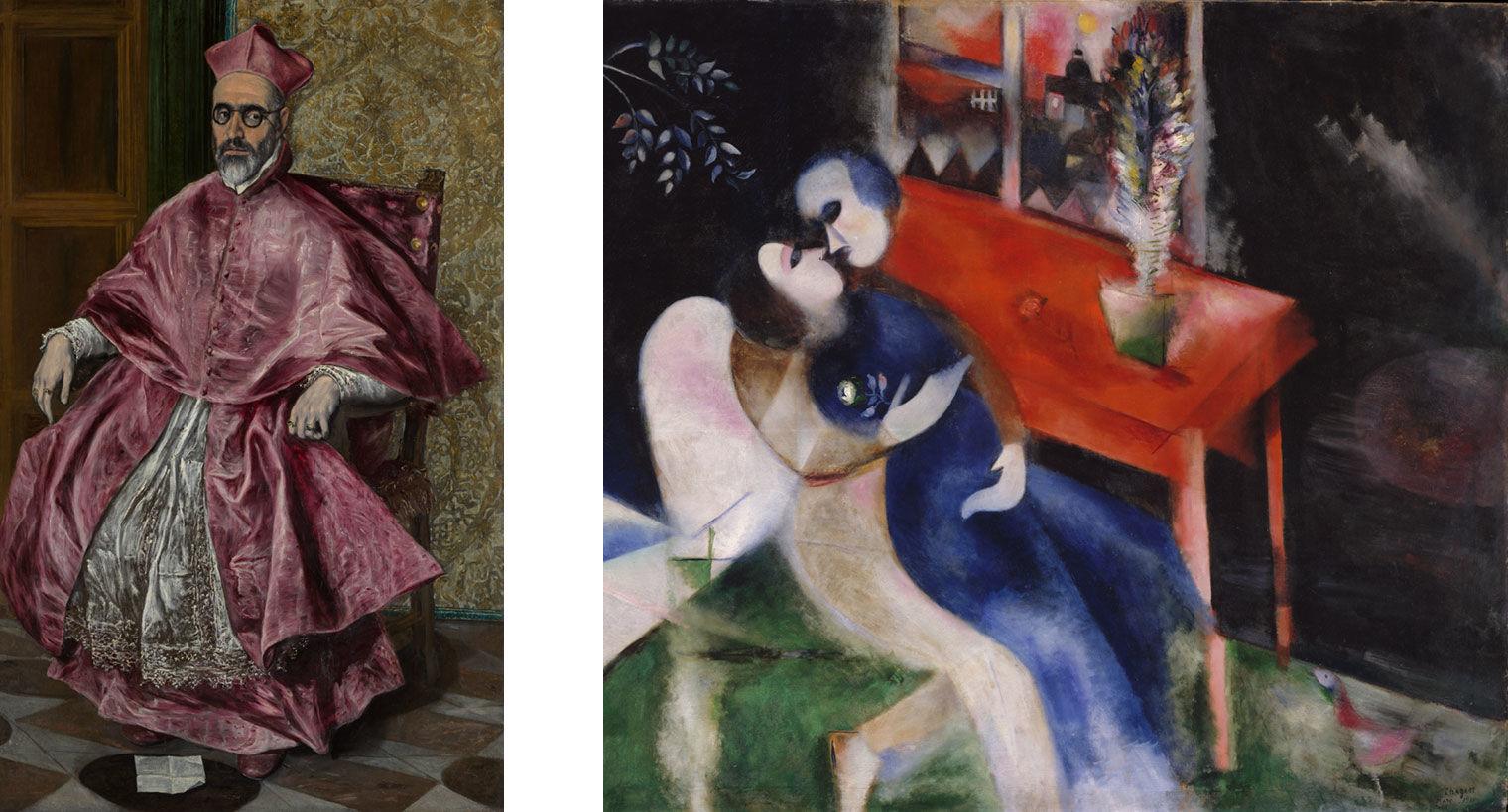 Left: El Greco (Greek, 1541–1614). Cardinal Fernando Niño de Guevara (1541–1609), ca. 1600. Oil on canvas, 67 1/4 x 42 1/3 in. (170.8 x 108 cm). The Metropolitan Museum of Art, New York, H. O. Havemeyer Collection, Bequest of Mrs. H. O. Havemeyer, 1929 (29.100.5). Right: Marc Chagall (French, 1887–1985). The Lovers, 1913–14. Oil on canvas, 42 7/8 x 53 in. (108.9 x 134.6 cm). The Metropolitan Museum of Art, New York, Jacques and Natasha Gelman Collection, 1998 (1999.363.14). © 2022 Artists Rights Society (ARS), New York