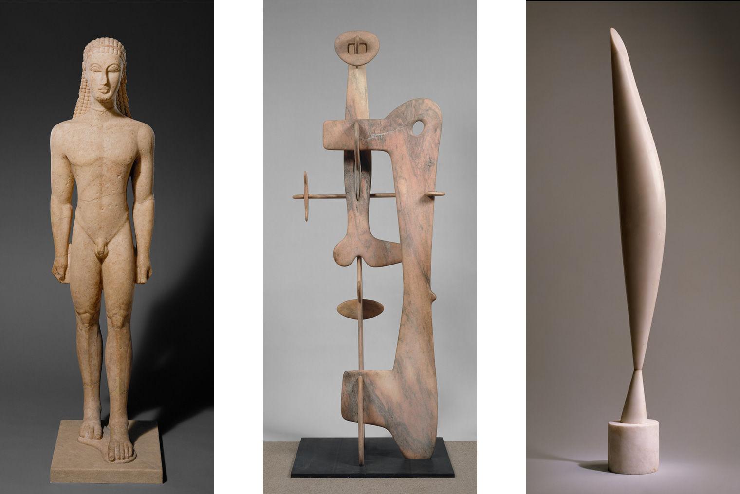 Left: Marble statue of a kouros (youth). Greek, Attic, ca. 590–589 B.C. The Metropolitan Museum of Art, New York, Fletcher Fund, 1932 (32.11.1). Middle: Isamu Noguchi (American, 1904–1988). Kouros, 1945. Marble, Height: 9 ft. 9 in. x 42 1/8 in. x 34 1/8 in., 619 lb. (297.2 x 107 x 86.7 cm). The Metropolitan Museum of Art, New York, Fletcher Fund, 1953 (53.87a–i). © 2022 Artists Rights Society (ARS), New York. Right: Constantin Brancusi (French, born Romania, 1876–1957). Bird in Space, 1923. Marble, Overall (with base): 56 3/4 x 6 1/2 in. (144.1 x 16.5 cm). The Metropolitan Museum of Art, New York, Bequest of FLorene M. Schoenborn, 1995 (1996.403.7ab). © 2022 Artists Rights Society (ARS), New York
