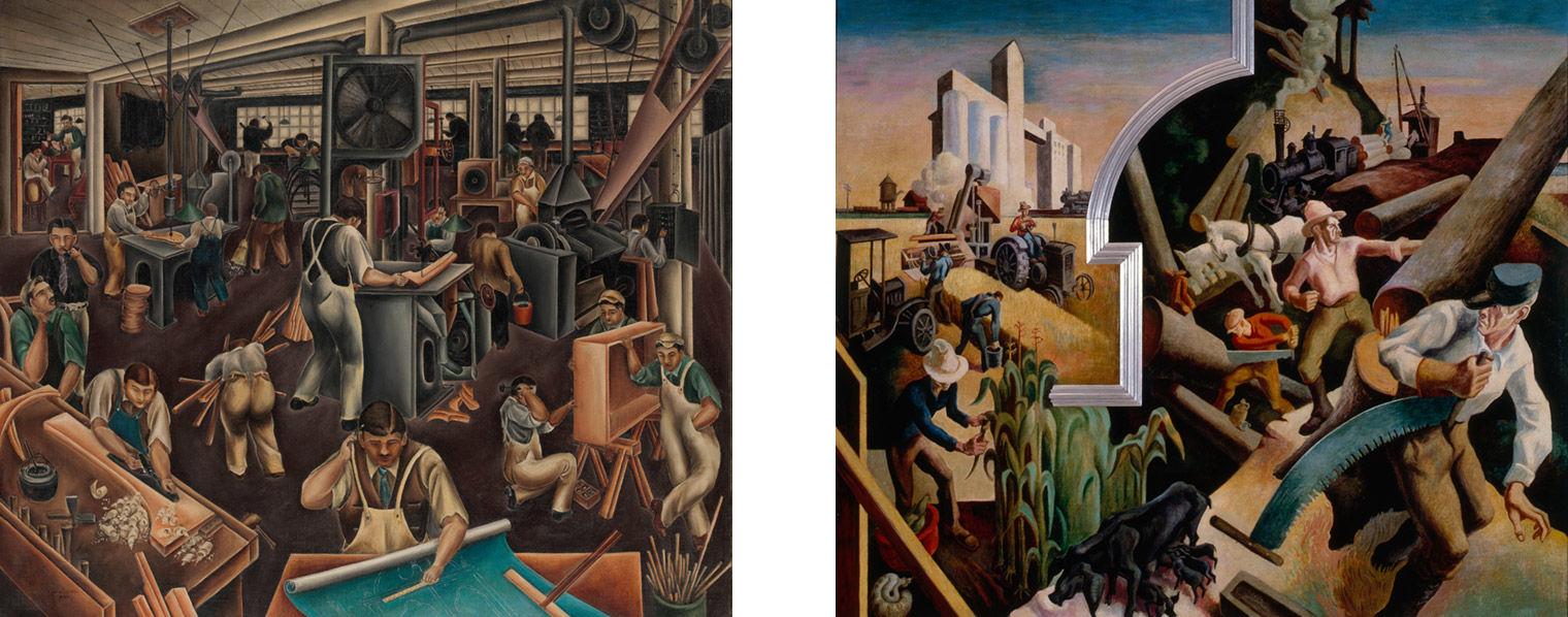 Left: Bumpei Usui (American, born Japan, 1898–1994). The Furniture Factory, 1925. Oil on canvas, 36 x 43 in. (91.4 x 109.2 cm). The Metropolitan Museum of Art, New York, Purchase, Arthur Hoppock Hearn Fund, by exchange, 2014 (2014.142). Right: Thomas Hart Benton (American, 1889–1975). America Today (detail), 1930–31. Ten panels: egg tempera with oil glazing over Permalba on a gesso ground on linen mounted to wood panels with a honeycomb interior, panel dimensions variable. The Metropolitan Museum of Art, New York, Gift of AXA Equitable, 2012 (2012.478a–j)