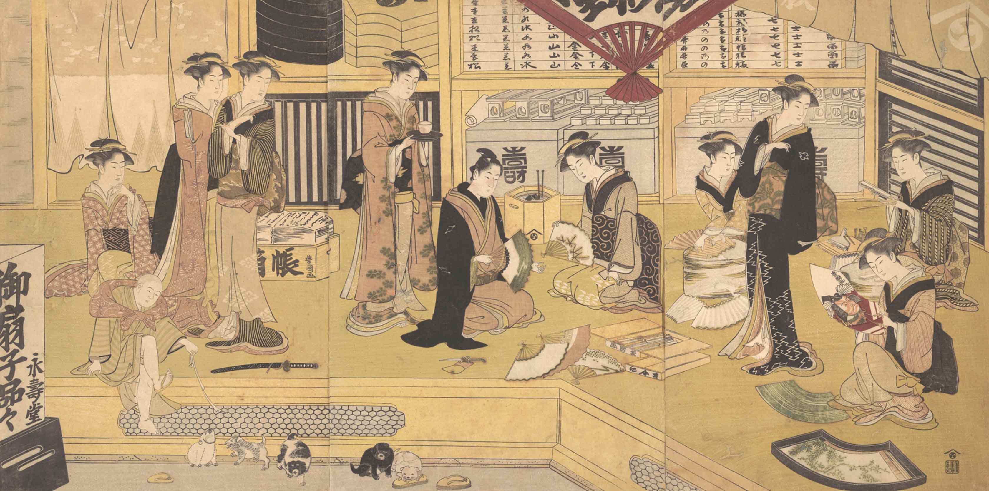 Utagawa Toyokuni (Japanese, 1769–1825). The Mieido Fan Shop, ca. 1785–93. Triptych of woodblock prints; ink and color on paper, 15 1/8 x 10 1/8 in. (38.4 x 25.7 cm). The Metropolitan Museum of Art, New York, The Howard Mansfield Collection, Purchase, Rogers Fund, 1936 (JP2725)