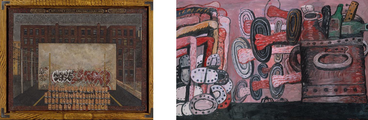Left: Martin Wong (American, 1946–1999). Attorney Street (Handball Court with Autobiographical Poem by Piñero), 1982–84. Oil on canvas, 35 1/2 x 48 in. (90.2 x 121.9 cm). The Metropolitan Museum of Art, New York, Edith C. Blum Fund, 1984 (1984.110). © The Estate of Martin Wong. Right: Philip Guston (American, born Canada, 1913–1980). The Street, 1977. Oil on canvas, 69 x 111 in. (175.3 x 281.9 cm). The Metropolitan Museum of Art, New York, Purchase, Lila Acheson Wallace and Mr. and Mrs. Andrew Saul Gifts, Gift of George A. Hearn, by exchange, and Arthur Hoppock Hearn Fund, 1983 (1983.457). © Estate of Philip Guston