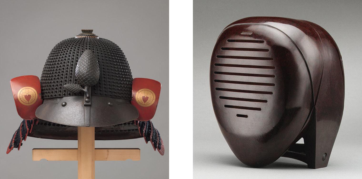 Left: Inscribed by Saotome Ienari (Japanese, active late 17th–early 18th century). Helment (Hoshi-Kabuto) in the 16th-Century Style. Iron, lacquer, silk, 11 3/4 x 13 in. (29.9 x 33 cm). The Metropolitan Museum of Art, New York, The Howard Mansfield Collection, Gift of Howard Mansfield, 1936 (36.120.407a, b). Right: Isamu Noguchi (American, 1904–1988). “Radio Nurse,” 1937. Bakelite, cellulose acetate, 8 x 6 1/2 x 6 1/2 in. (20.3 x 16.5 x 16.5 cm). The Metropolitan Museum of Art, New York, John C. Waddell Collection, Gift of John C. Waddell, 2000 (2000.600.14). © The Isamu Noguchi Foundation and Garden Museum