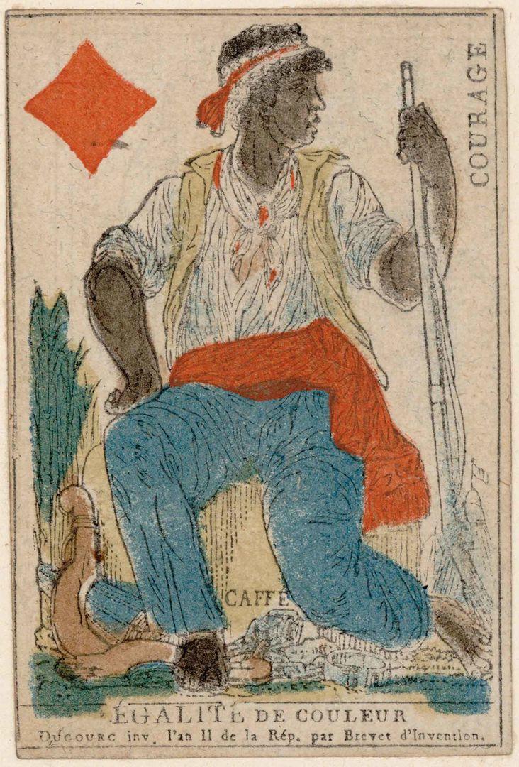 NARRATOR: Picture a playing card from the late eighteenth century. It bears the French inscriptions: “COURAGE” and “ÉGALITÉ DE COULEUR,” which roughly translate to “courage” and “equality of the races.” It was part of a larger set of revolutionary-themed cards designed by Jean Démosthène Dugourc in 1794, the year France first officially abolished slavery in its colonies.